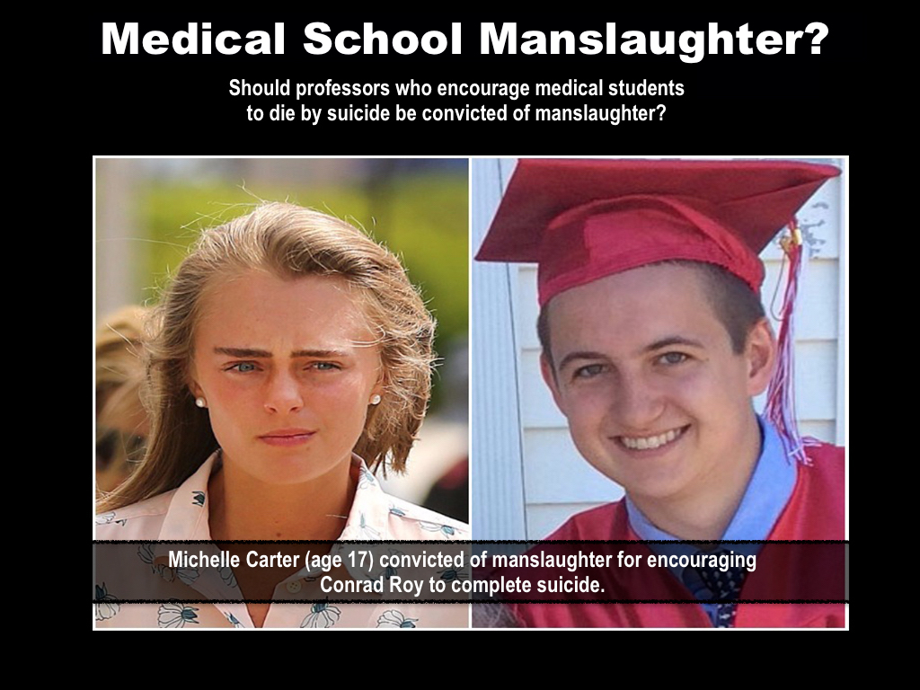 Michelle Carter has just been convicted of manslaughter for encouraging Conrad Roy to complete suicide in 2014. “Hang yourself, jump off a building, stab yourself,” she said. Michele was 17 at the time. So what should happen to medical school professors who use the same words,